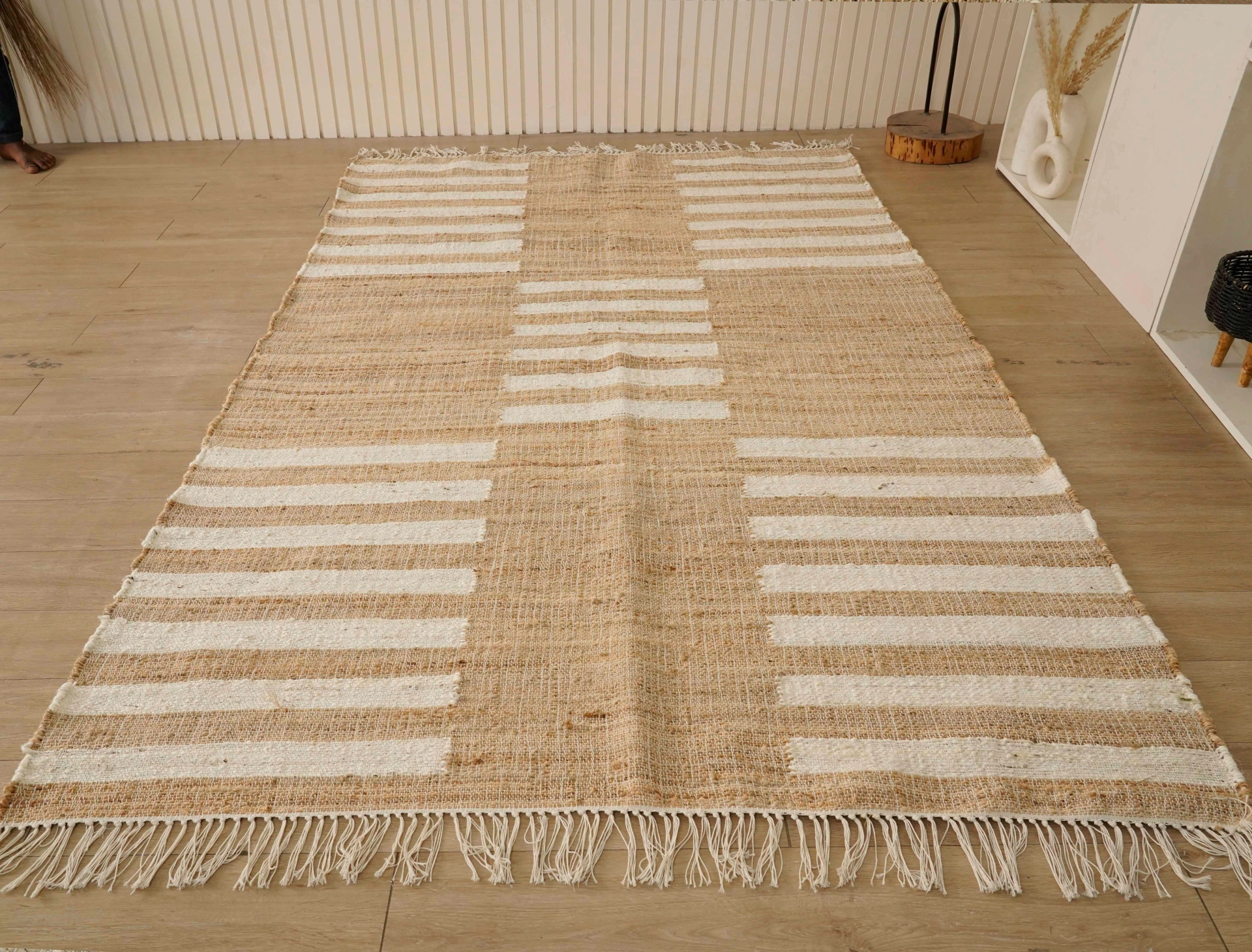 Beige With White Stripes Design Bohemian Boho Moroccan Rug Fringes Jute Rug Hand Woven Bohemian Decor Rug