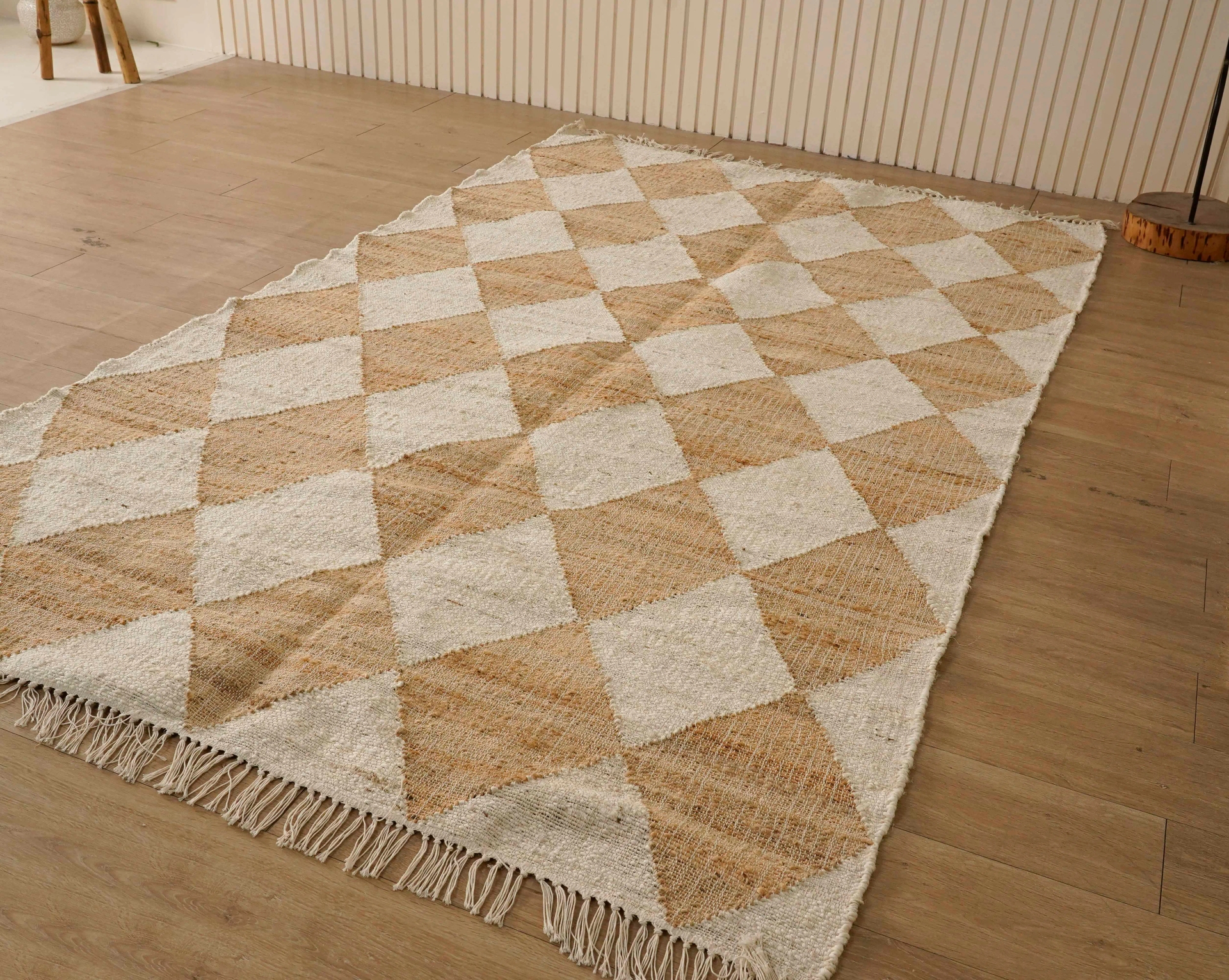 Handwoven Juna Rug, Nordic Scandi Rug in Beige and White Diamond Box Design, Large Area Rug For Living Room