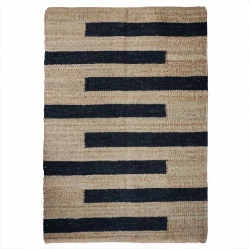 Indian Handwoven Natural Jute Hemp Rug with Black Stripes